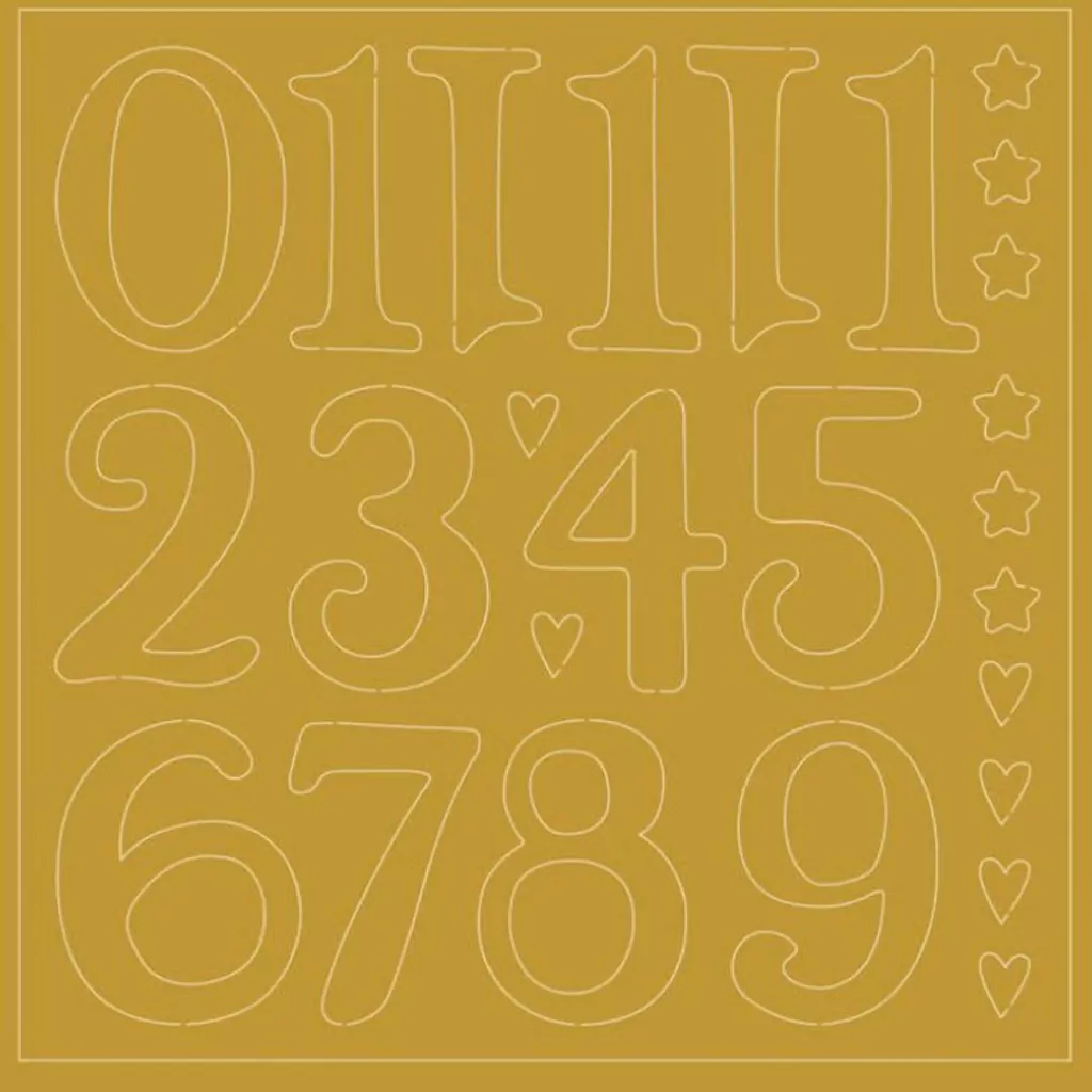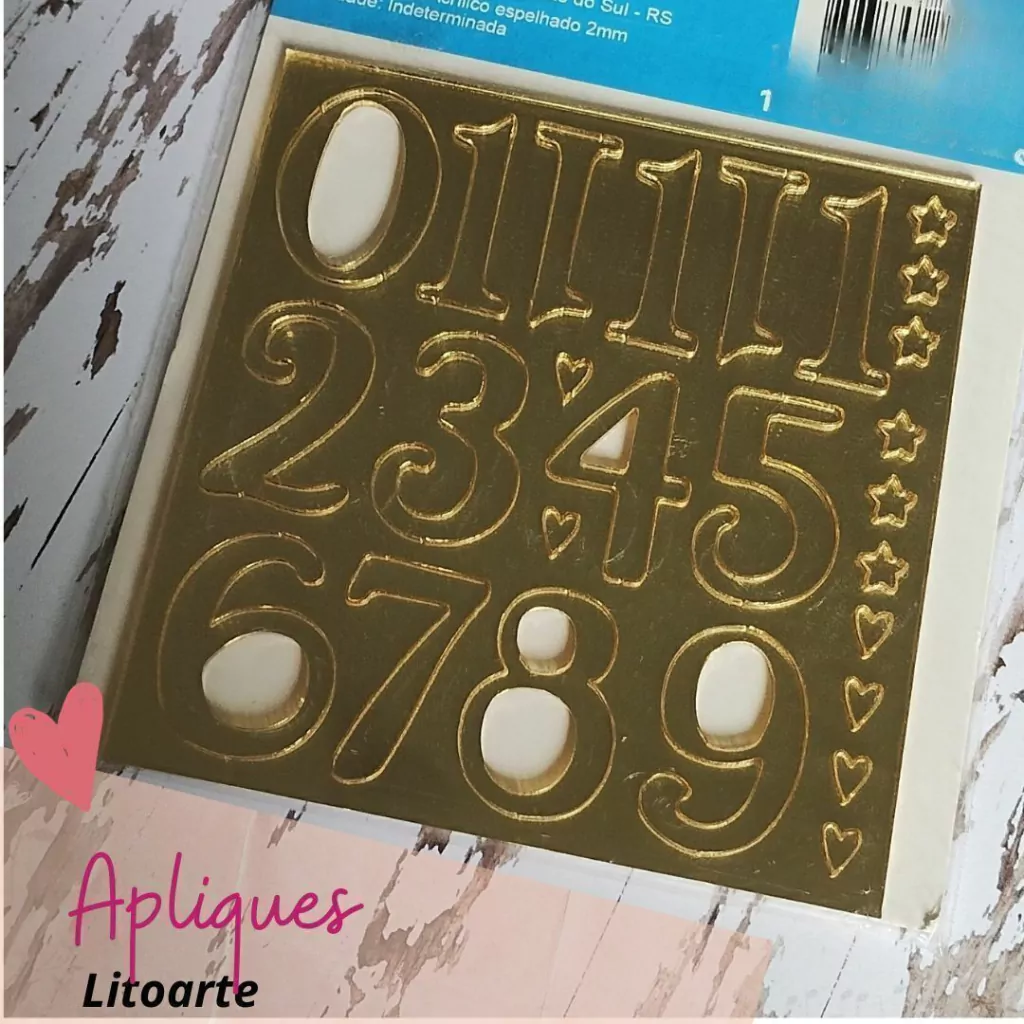 1 Cartela de Apliques Numeral com 14 peças destacáveis, com estrelas e coraçoes de brinde, conforme a imagem.