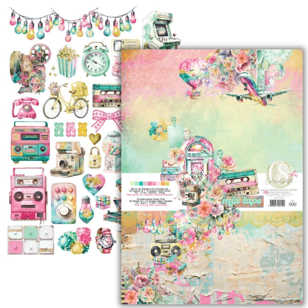 A Coleção MIX TAPE foi desenvolvida pela Carina Sartor em uma paleta de cores vibrantes que marcaram época. Com temática voltada para elementos dos anos 80´s e 90´s para você voltar no tempo e registrar sua história com muita cor e alegria. Além de muitos objetos nostálgicos, explore o tema de viagem e muita música, com homenagem à saudosa Rita Lee em lettering exclusivos do artista Adriano JS feitos com muito amor.