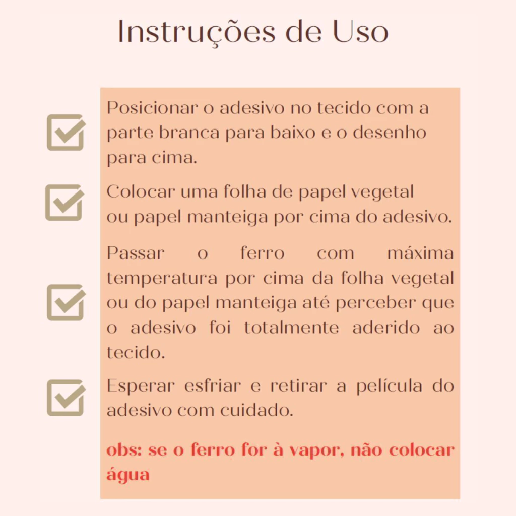 Para ser aplicado no tecido utilizando prensa ou o ferro elétrico de passar roupas.