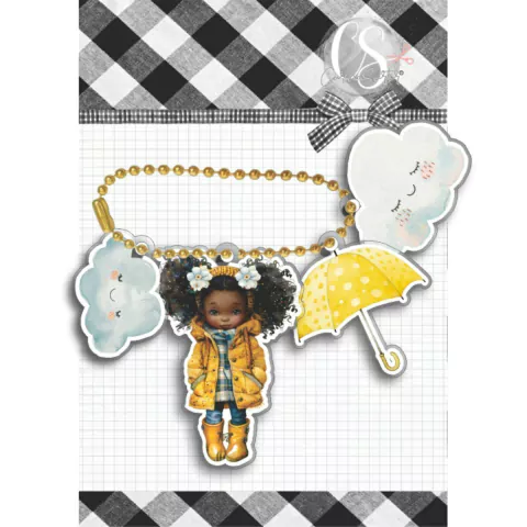 Imagens: Menina 4,7x6,8cm, guarda-chuva 4,6x4,8cm e nuvens 3,6x45cm e 2,9x4cm.